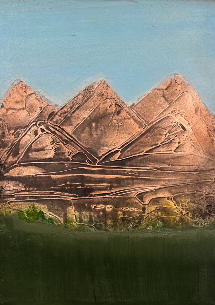 «Langs Sedimenten» Akryl og mixed media. 24 x 18 cm m/ valnøtt ramme. Kr. 500,-